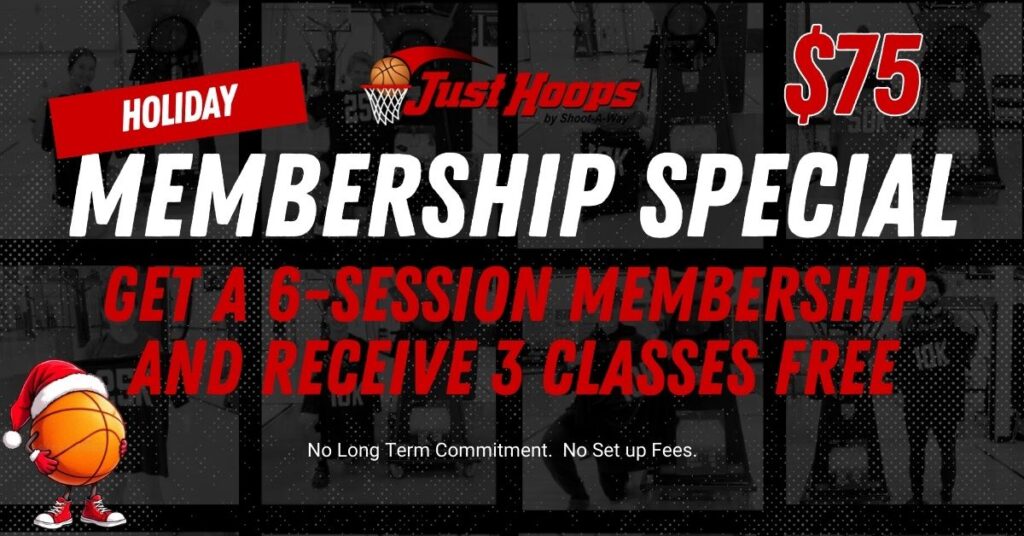 Give your player the gift of improvement this holiday season. With our Holiday Membership Special, you’ll receive 6 sessions for $75, plus 3 FREE class sessions, with no long-term commitment and no hidden fees. Your athlete gets valuable time on the court, focused repetitions, and the ability to track their progress and measure their improvement through Just Hoops Player Portal technology.