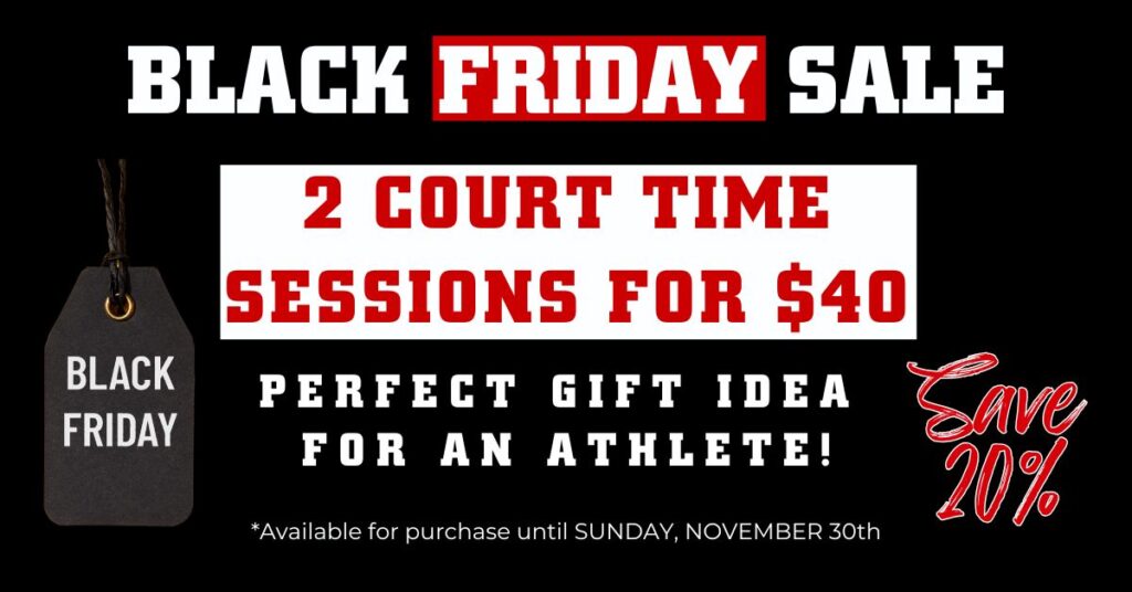 Take advantage of our Black Friday Sale! For a limited time, you can purchase 2 Court Time Sessions for just $40 — a savings of 20%. This offer is available now through Sunday, November 30th and is a great opportunity for players to get extra gym time, more reps, and build confidence this holiday season.