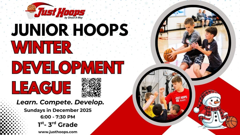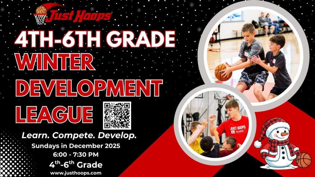 The Just Hoops Winter Development League (1st-3rd Grade) is designed to help athletes improve their understanding of game concepts and translate their skills into live-play settings.